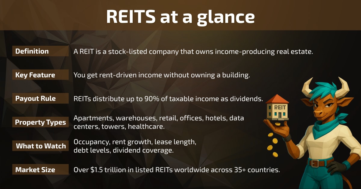 When you buy a Real Estate Investment Trust (REIT) you buy tiny slices of many buildings that collect rent and share it with you as dividends. Think of it like owning part of a city’s infrastructure through one ticker. Returns come from two streams: steady income and growth in rents over time.