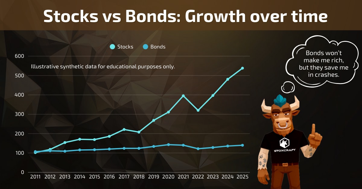 Long-term charts show the difference: stocks deliver stronger growth, bonds provide stability.