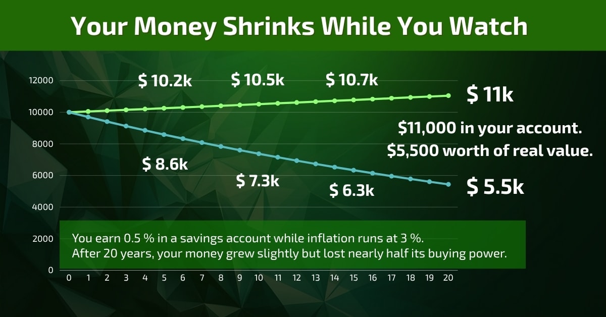 But that feeling of safety can be misleading. If your account earns 0.5% but inflation runs at 3%, you’re not standing still. You’re sliding backwards. The risk isn’t obvious. There’s no chart showing your loss. But over time, your money quietly loses power. You save more, but you can buy less.