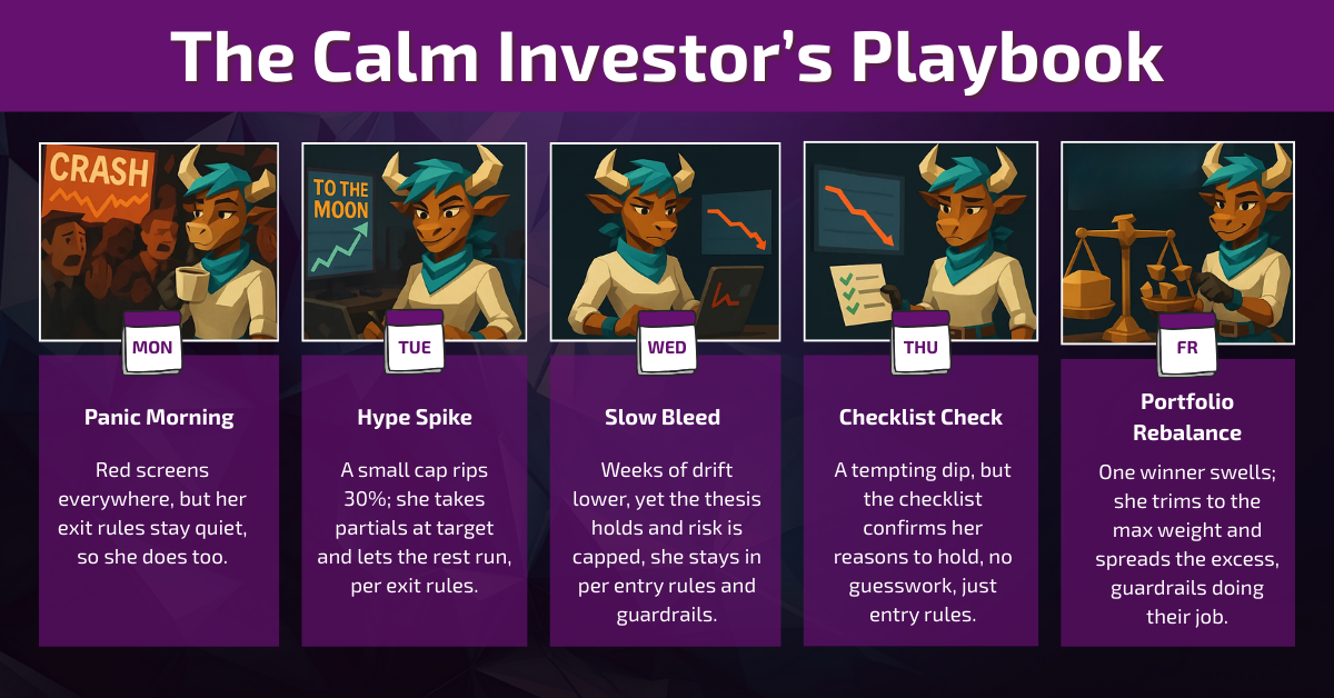 A major holding reports earnings today. Her checklist reminds her: no new buys before results, partial profits on oversized winners. She follows through, watching others panic-buy or dump shares on impulse.